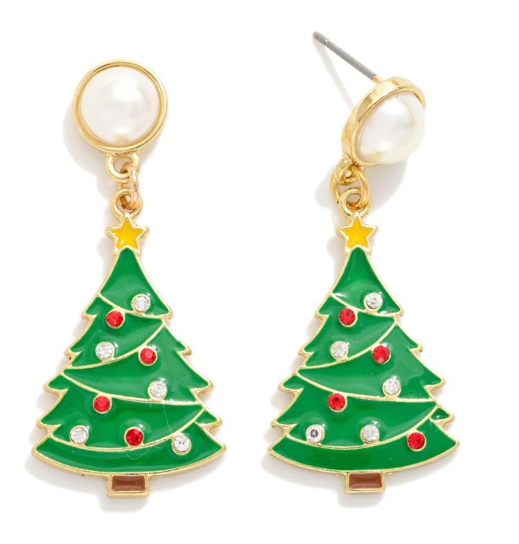 Enamel Christmas Tree Drop Earrings With Pearl Post Drop Featuring Rhinestone Accents