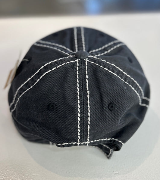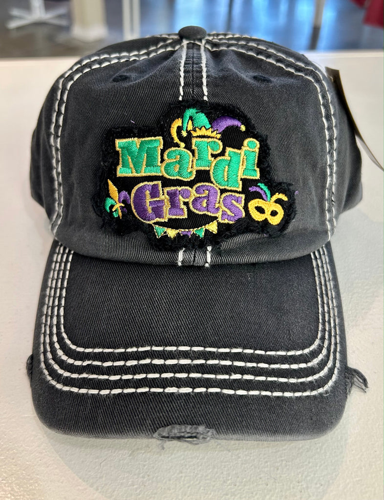 Super cute distressed cap featuring a vintage Mardi Gras patch and an adjustable velcro closure.