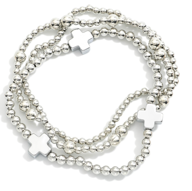 Set of Three Metal Tone Beaded Stretch Bracelets Featuring Dainty Metal Tone Cross Beads