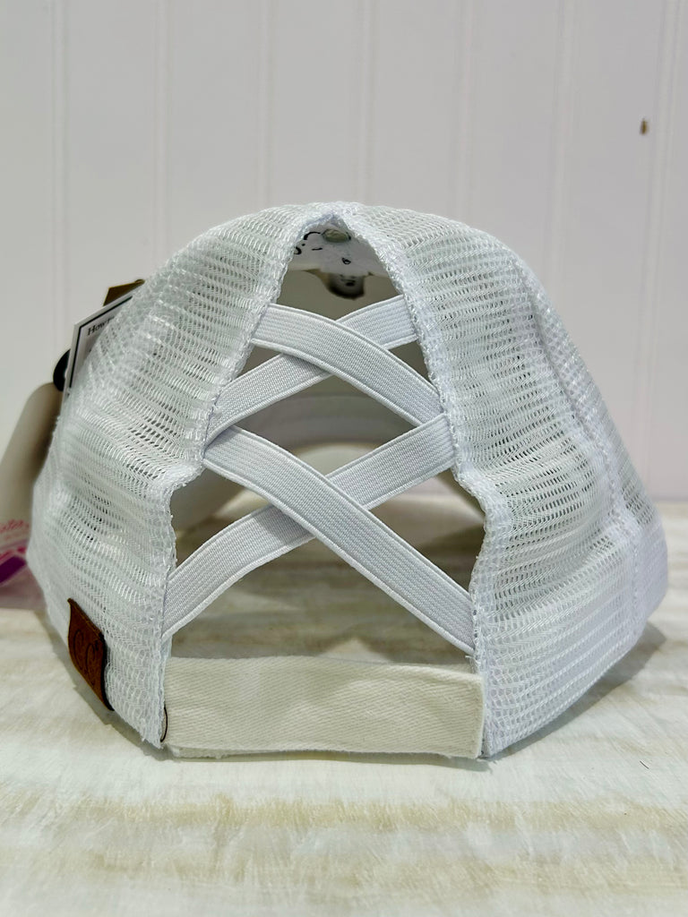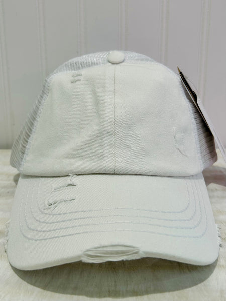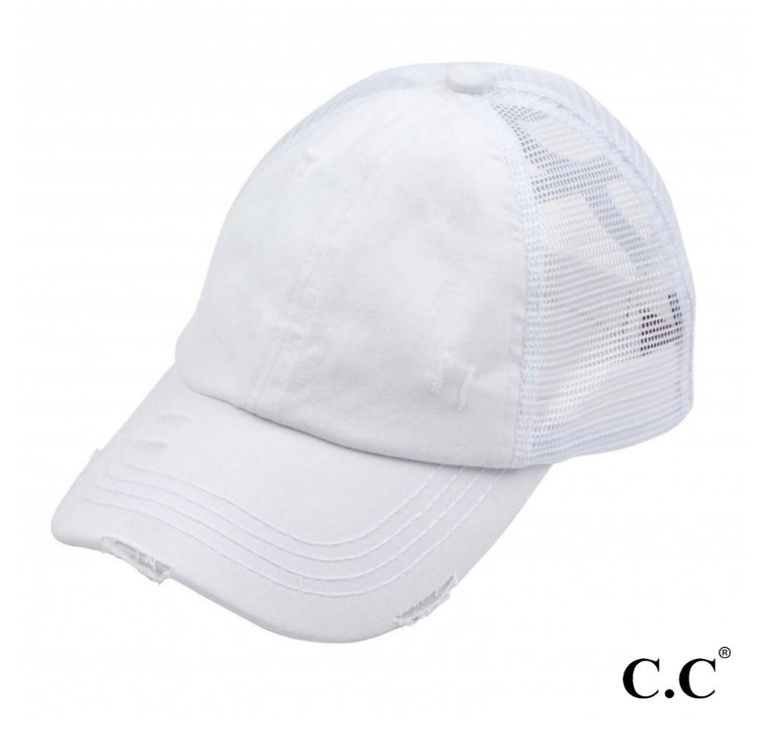 Super cute distressed white CC baseball cap with an elastic criss cross ponytail opening, a mesh back, and an adjustable velcro closure.