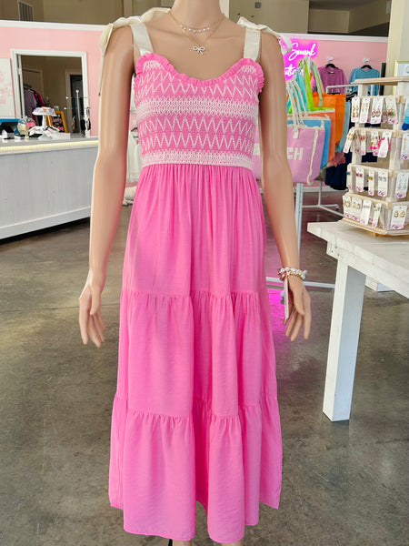 This pink tiered maxi dress is sure to impress everyone with its sweetheart neckline, ribbon straps, and smocked bodice with white embroidery.