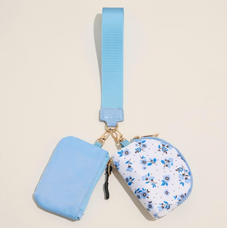Solid & Petite Blue Flower Print Two Pouch Wristlet