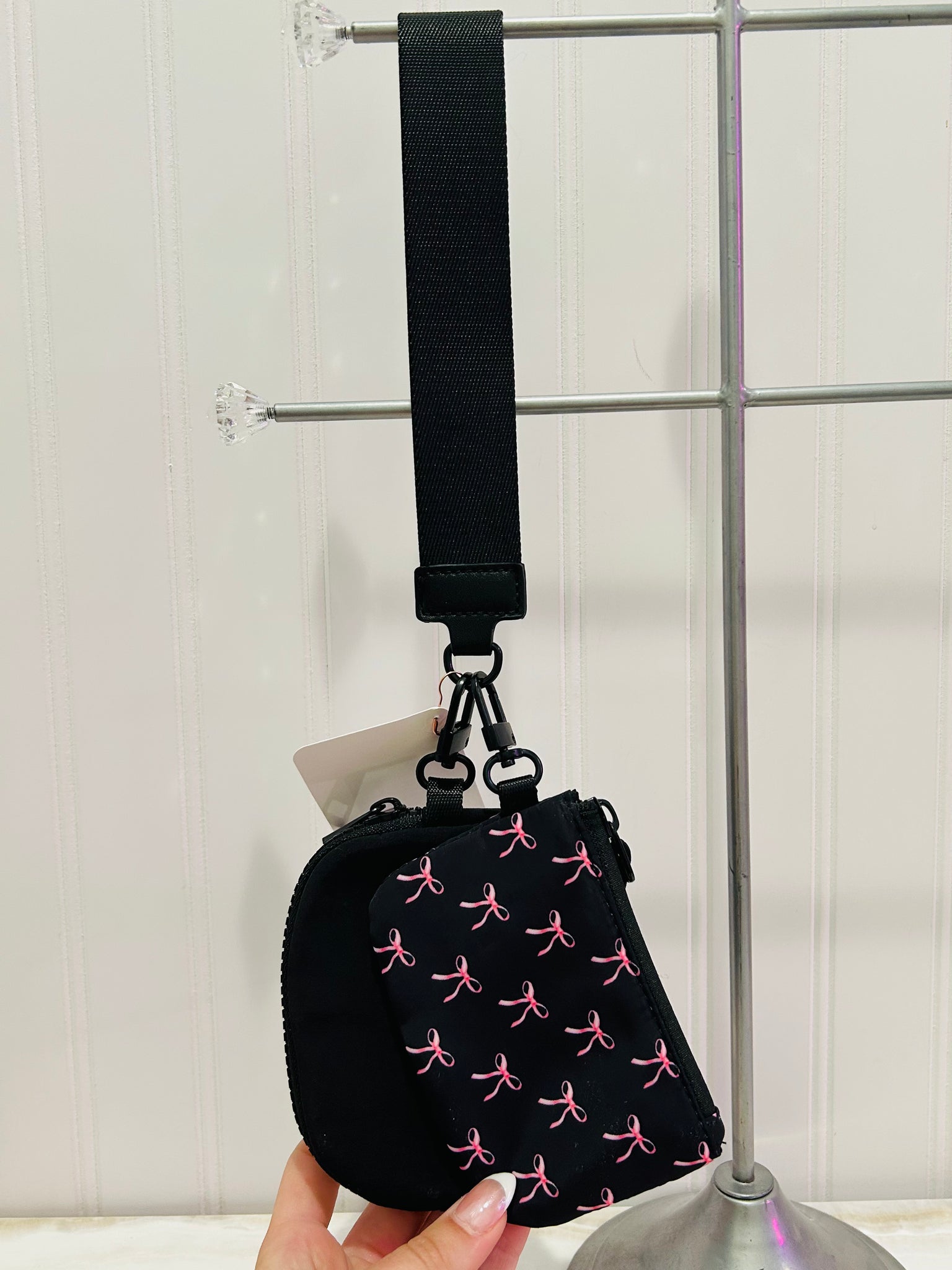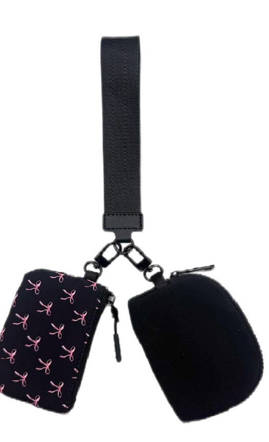 Two Pouch Wristlet Keychain Wallet. One Black. One Black with Pink Bows.