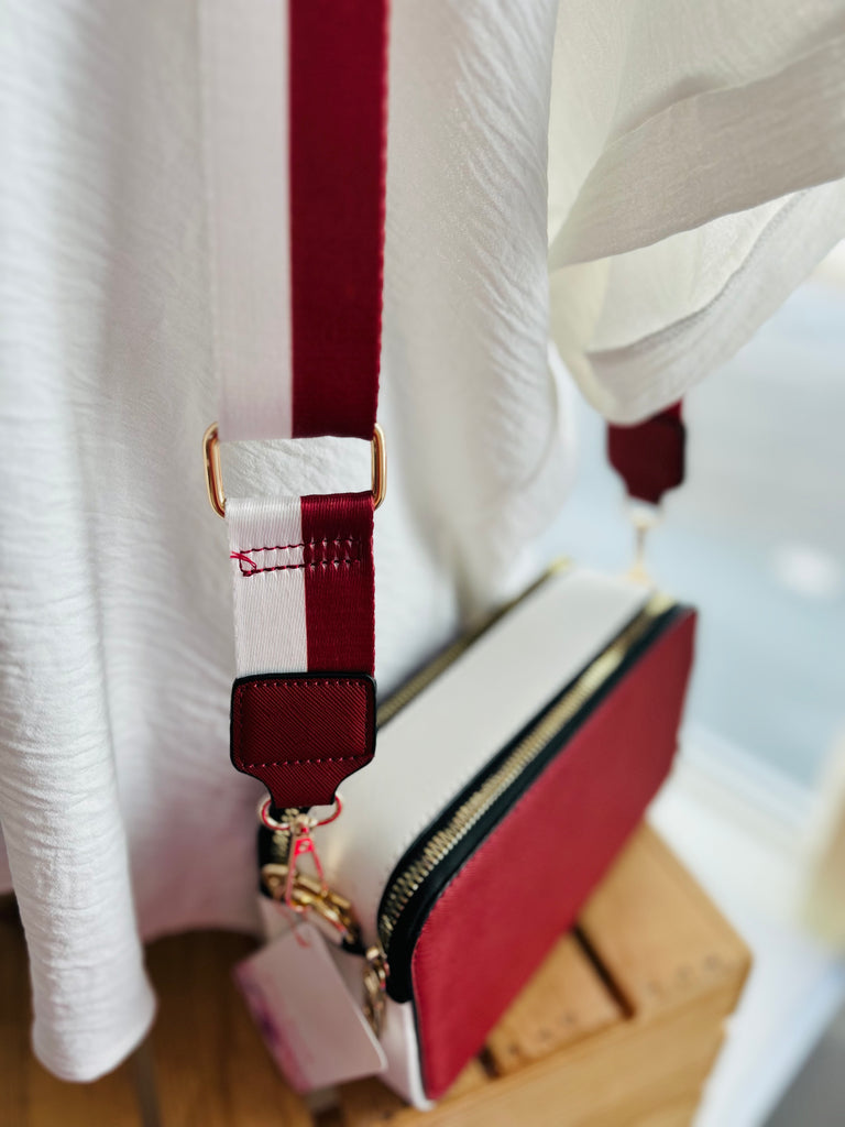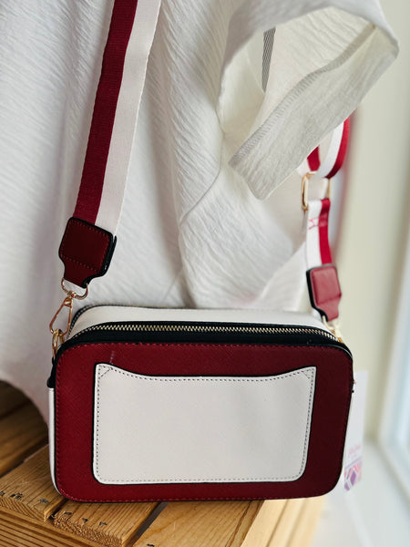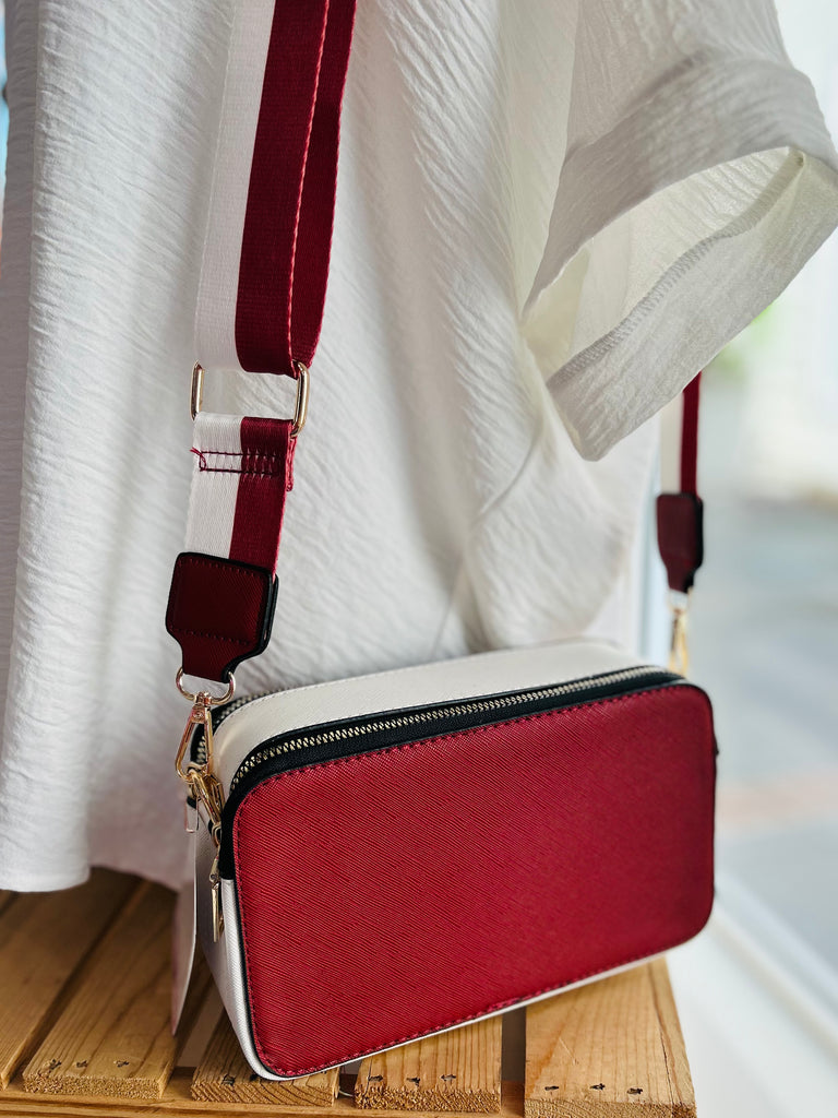 - Maroon/ White - Full Zipper Closure - Two Main Body Pockets / One Open Back Pocket - Two Tone Adjustable/Removable Canvas Strap - Body Approximately 8"W X 5"T X 2"D - Strap Adjustable 25-50" L