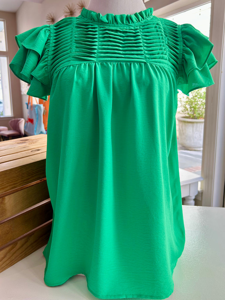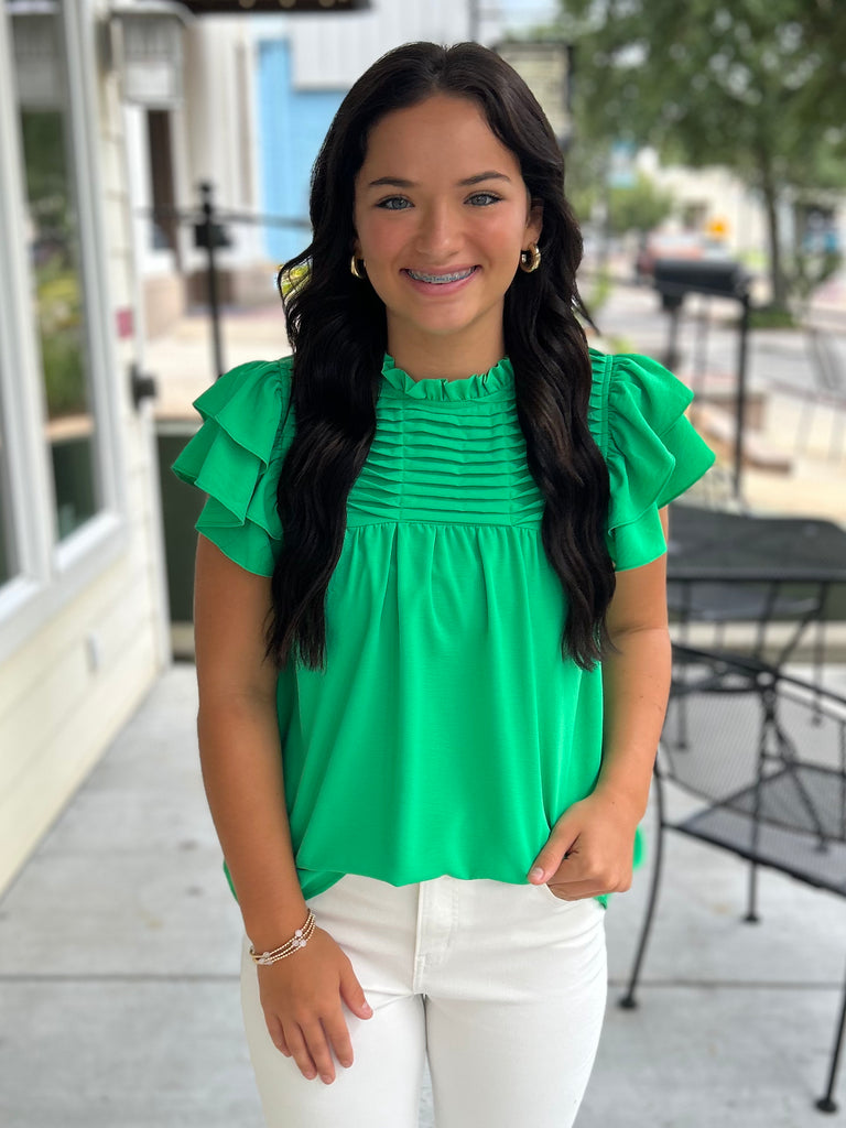 Obsessed is an understatement! This green blouse is all things girly and gorgeous with its ruffle sleeves and pleated yoke detail. Lightweight and breezy—perfect for dressing everywhere and anywhere! Made of 100% polyester.