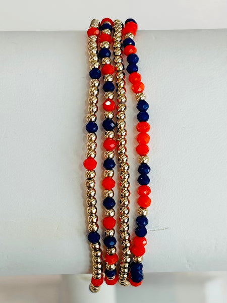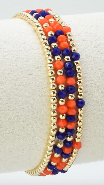 Set of 4 Orange and Navy Glass Bead and Gold Stretch Bracelets. Great for Gameday!