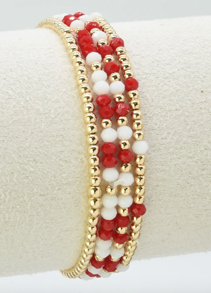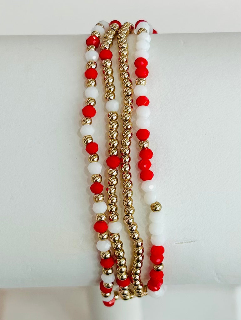 Set of 4 Red and White Glass Bead and Gold Stretch Bracelets. Great for Gameday!