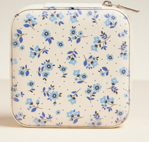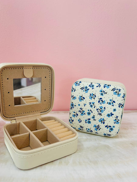 - Full Zipper Closure - Mirror & Earring Holder Divider - Removable Divider Organizer - 6 Ring Slots & 3 Necklace Hooks - Approximately 3.5" L X 3.75" T X 2" D