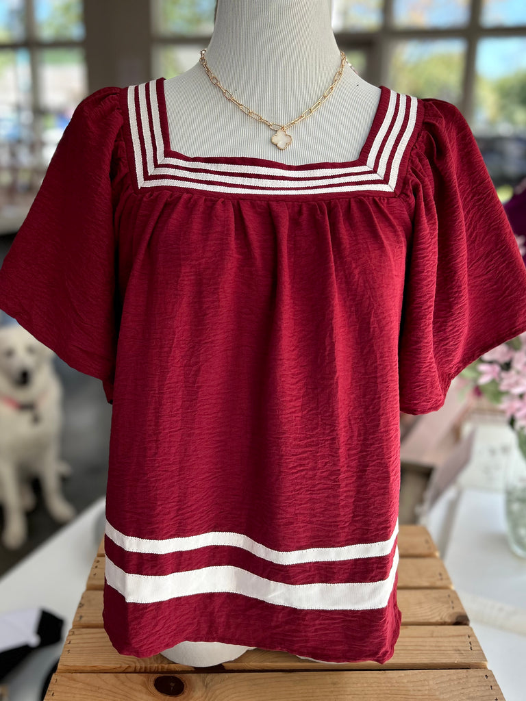 Cheer on your team in style with this flare short sleeve woven top featuring a trendy square neckline and bold contrast tape detail. Lightweight and flowy—perfect for tailgates, stadium seats, or watch parties! Made of of polyester.