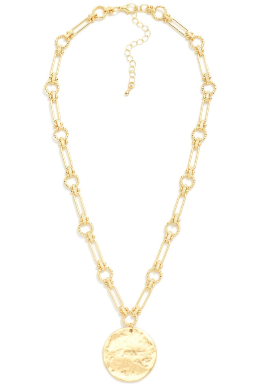Chain Link Necklace Featuring Twisted Metal Circle Stations & Hammered Metal Pendant