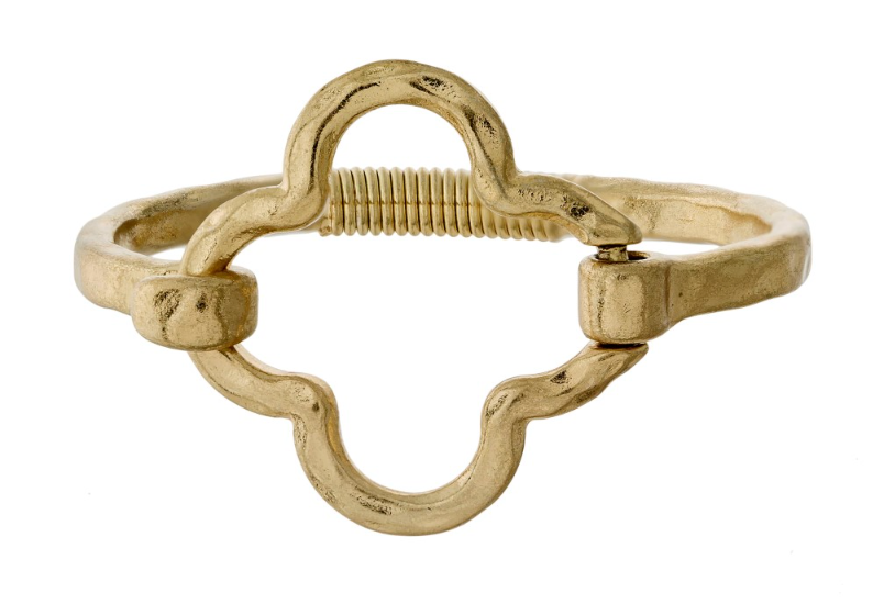 Gorgeous hammered metal hinge bracelet with an open clover focal.