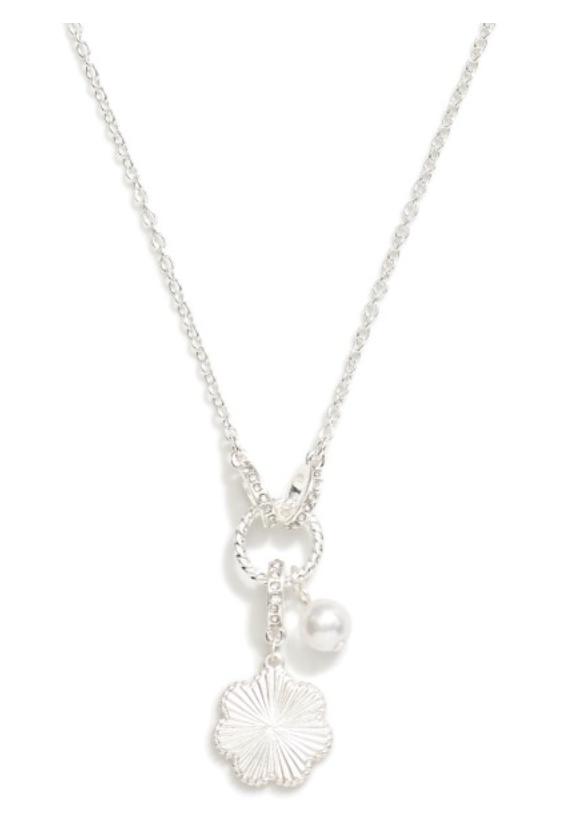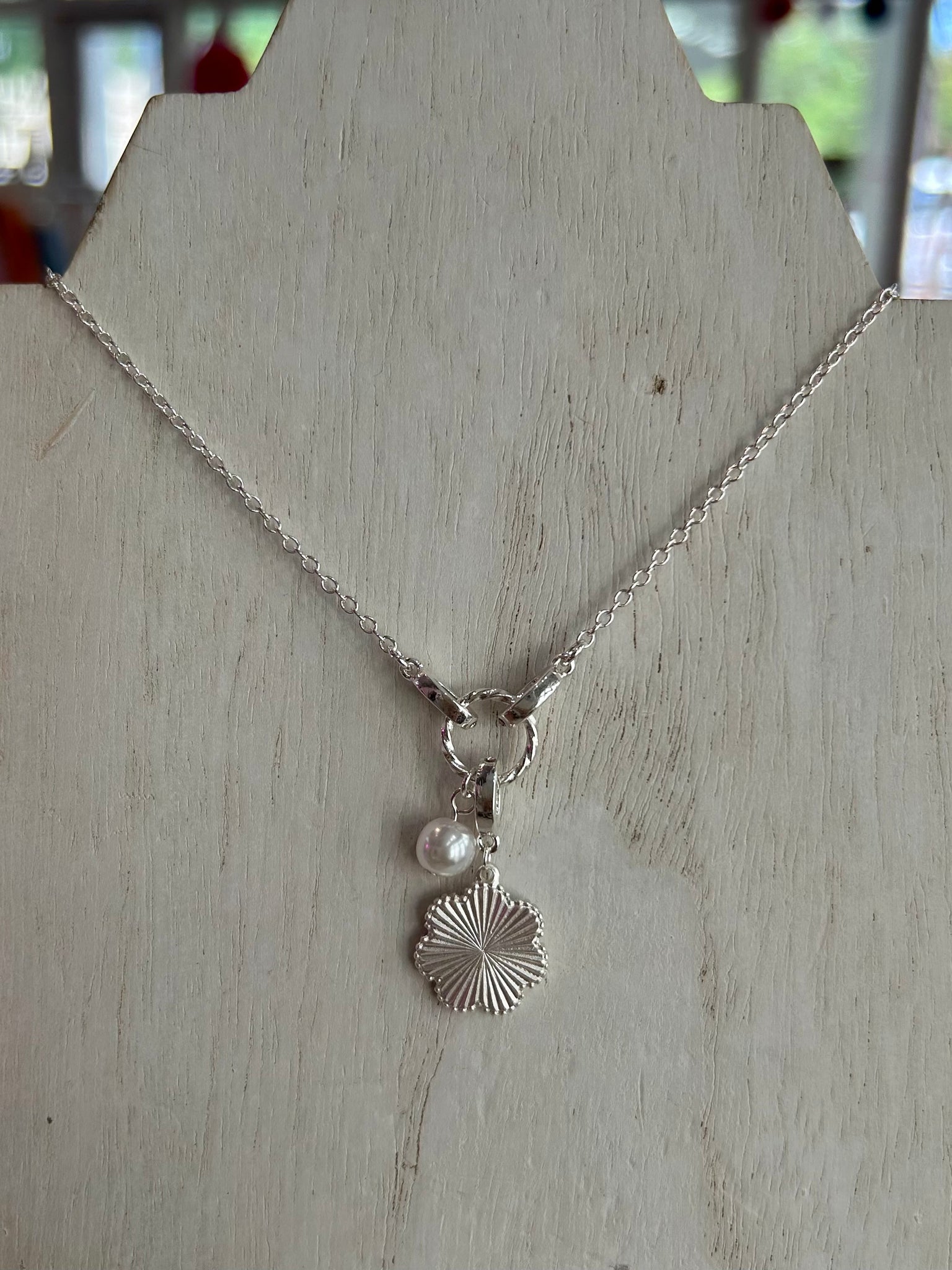 Hoop Pendant Necklace with Pearl & Flower - Silver
