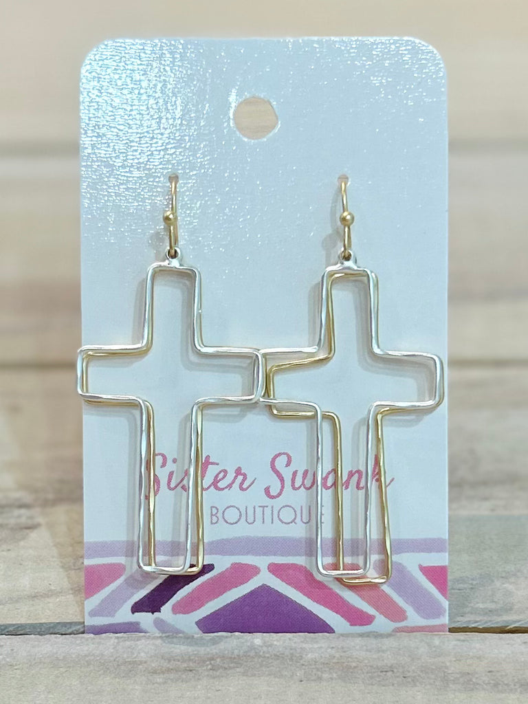Layered Hammered Metal Hollow Cross Drop Earrings