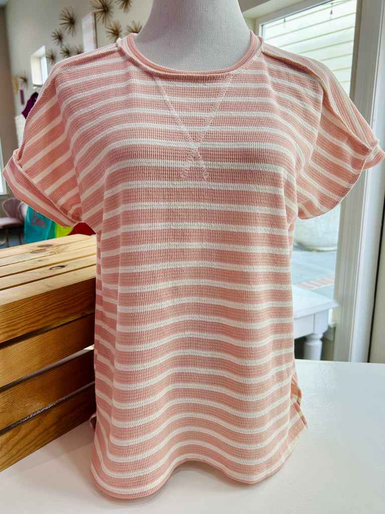 This top is made of lightweight material great for summer, and features a stripped pattern, round neckline, drop shoulder short sleeves.