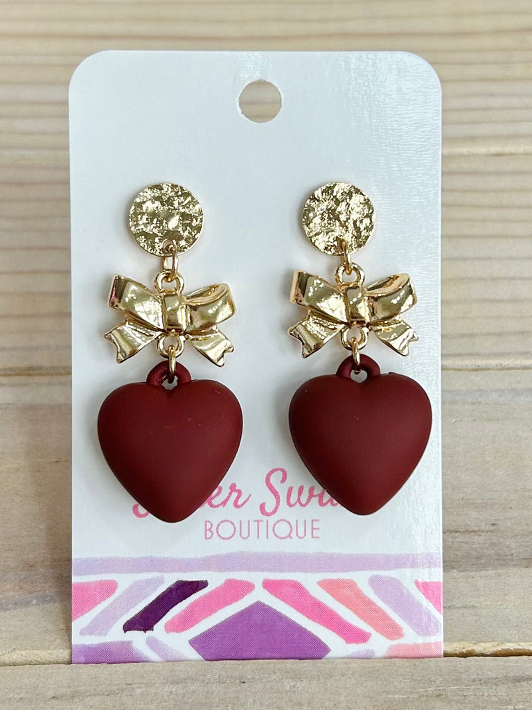 Hammered Circle Stud with Gold Bow and Maroon Heart 2" Drop Earrings. Perfect for Gameday!