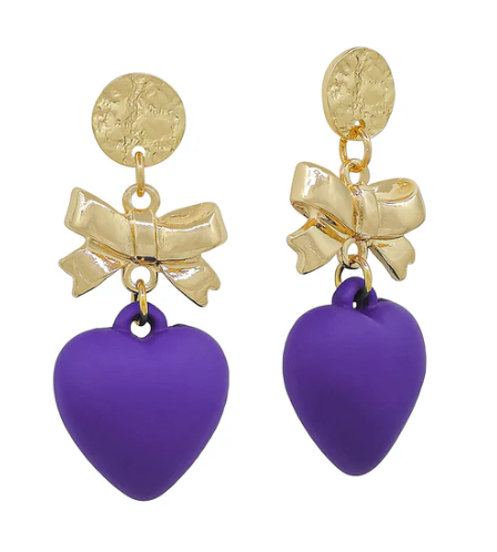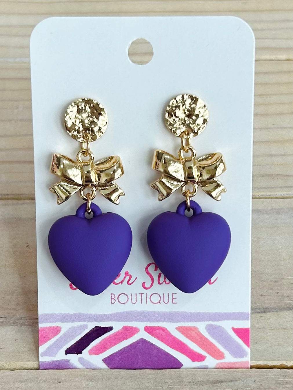 Hammered Circle Stud with Gold Bow and Purple Heart 2" Drop Earrings. Perfect for Gameday!