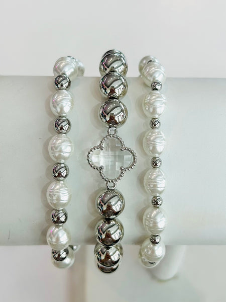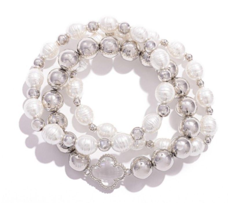 Set Of Three Metal Tone & Pearl Beaded Stretch Bracelets Featuring Glass Crystal Clover Detail