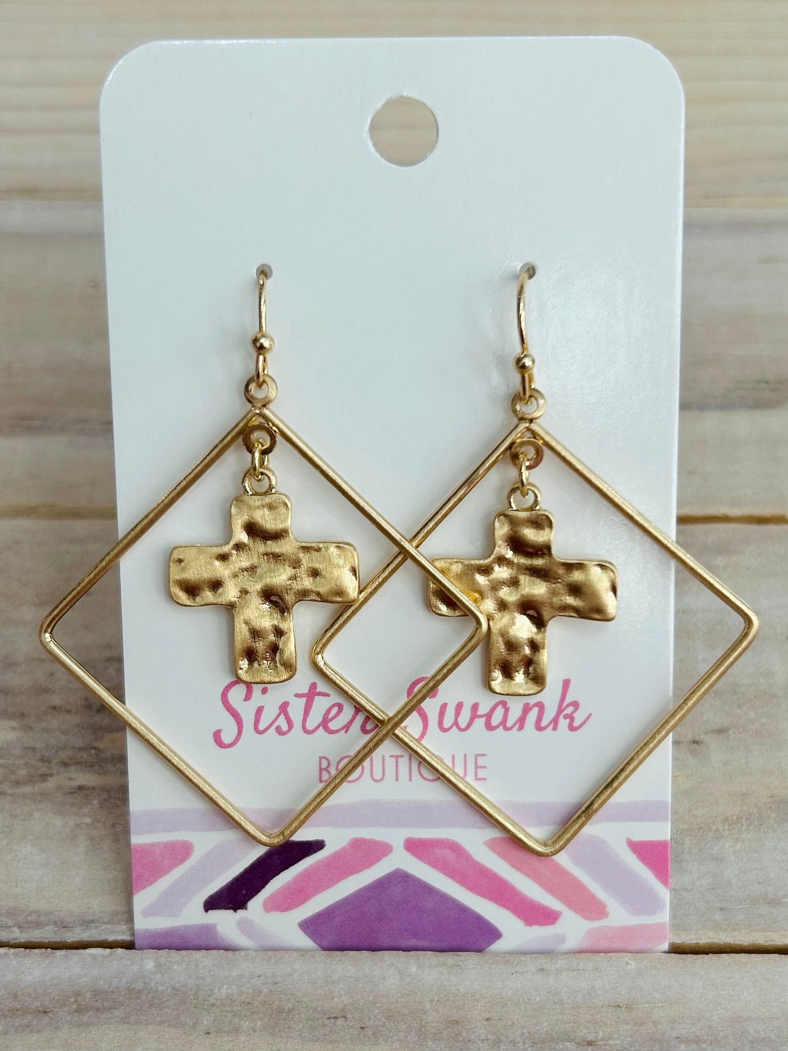 Nesting Hammered Metal Cross & Diamond Drop Earrings