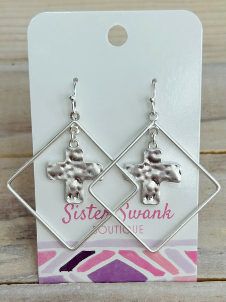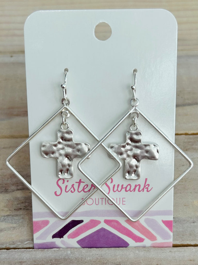 Nesting Hammered Metal Cross & Diamond Drop Earrings