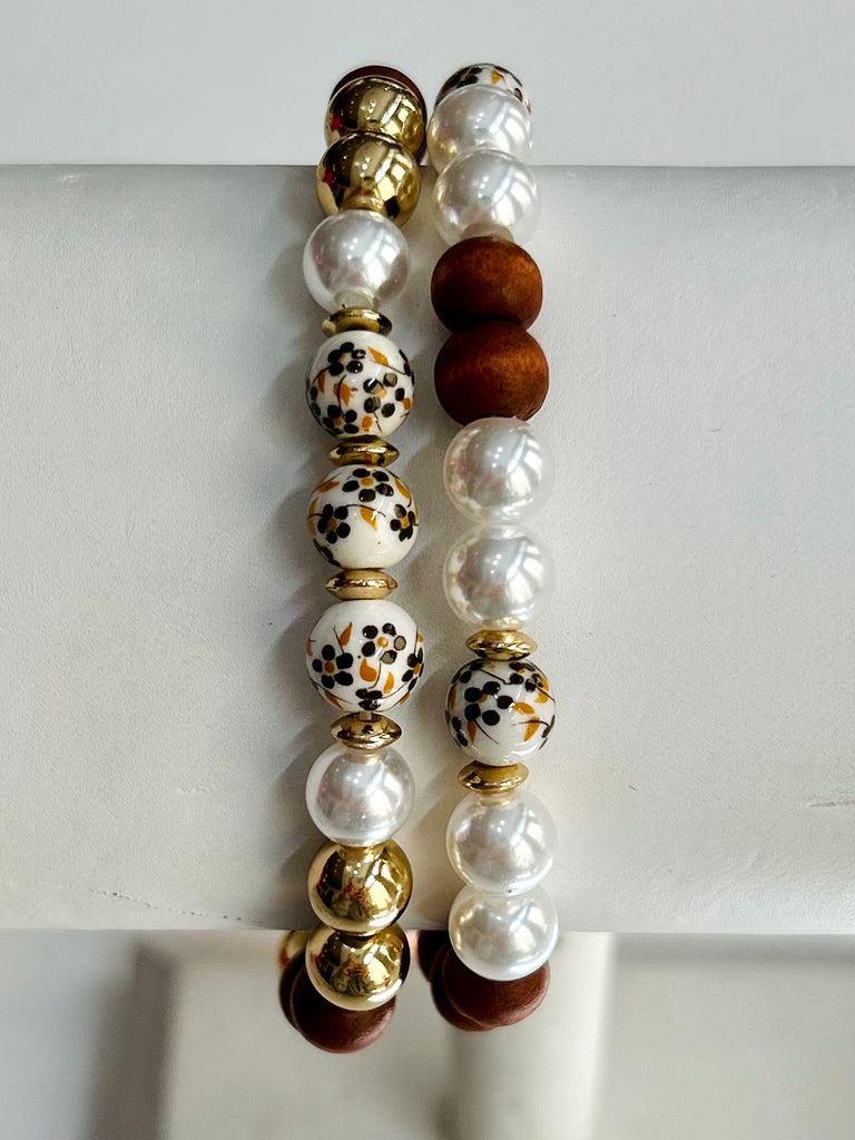 Set of Two Beaded Stretch Bracelets Featuring Wood, Pearl, & Floral Porcelain Beads