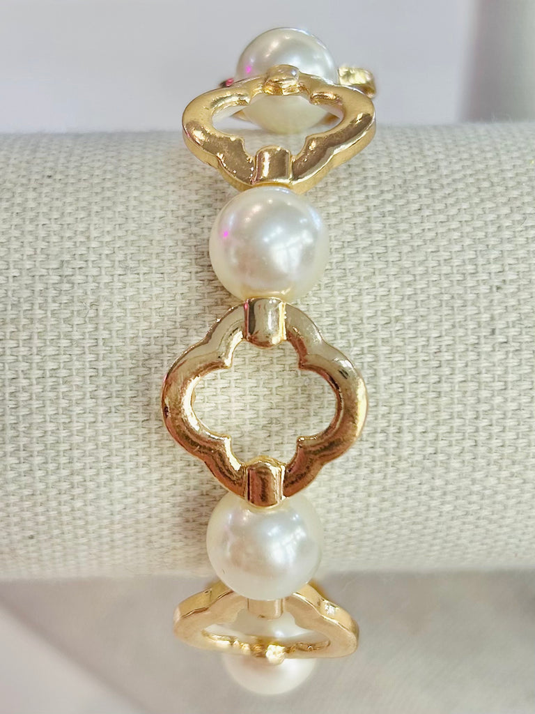 Pearl & Metal Tone Hollow Clover Stretch Bracelet