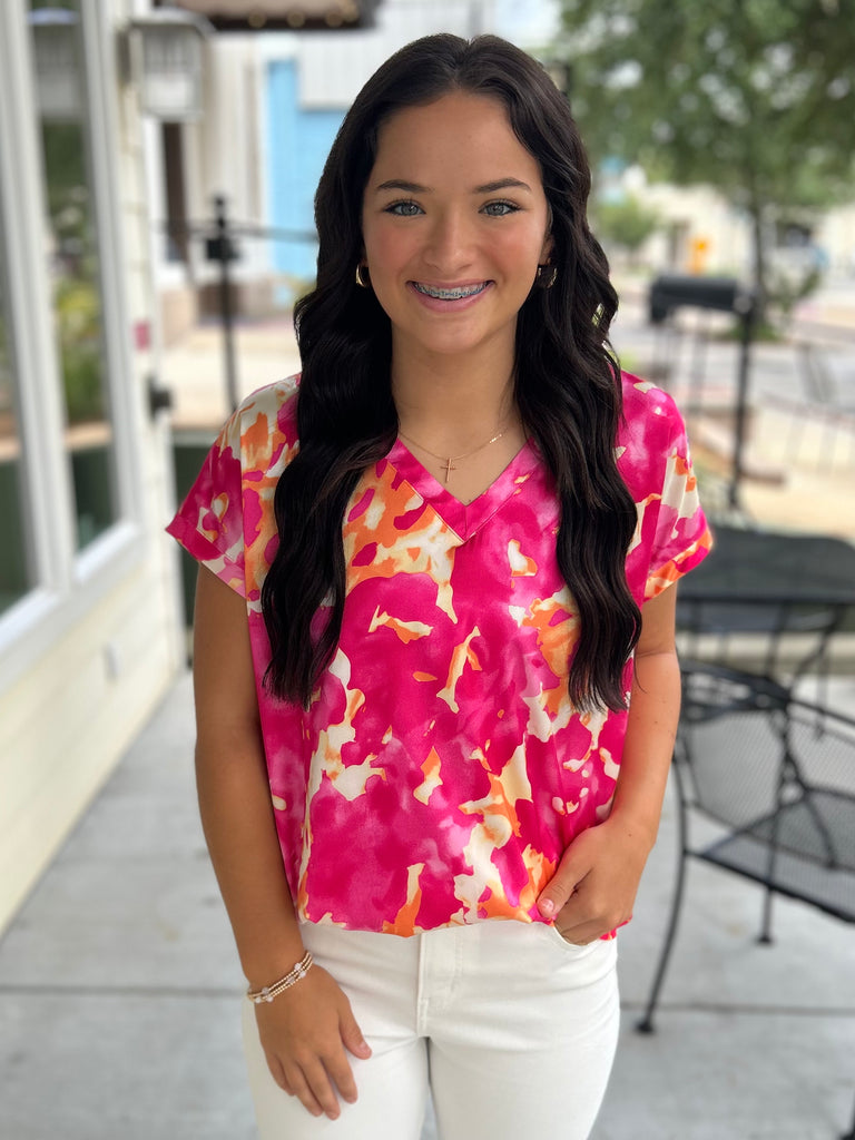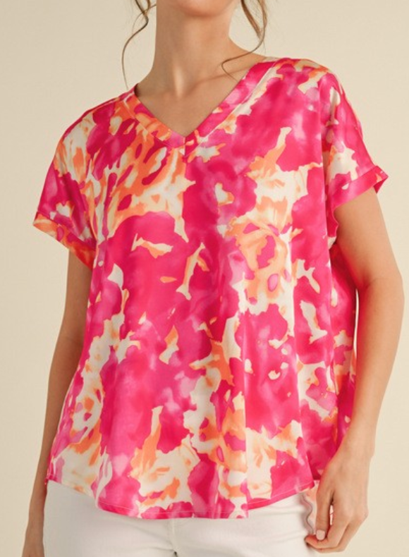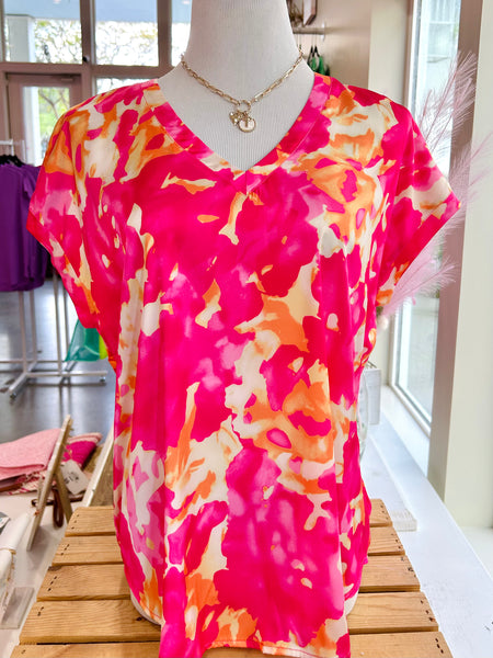 The Perfectly You Blouse has a bright pink and orange abstract print with short cap sleeves and raw edge hems. Super cute and lightweight. Made of 100% polyester.