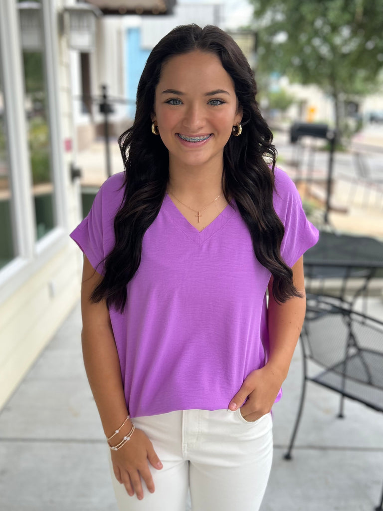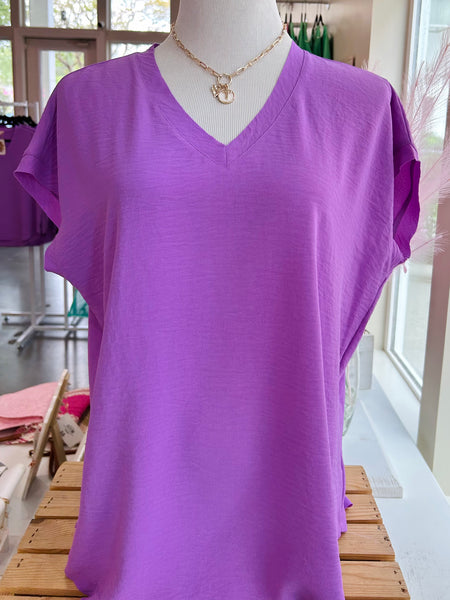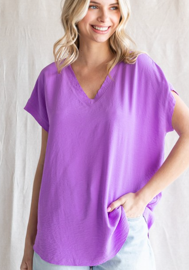Cute and simple solid purple top with a v-neckline, short cap sleeves, and raw edge hems. Non-sheer, lightweight. Made of 100% polyester.