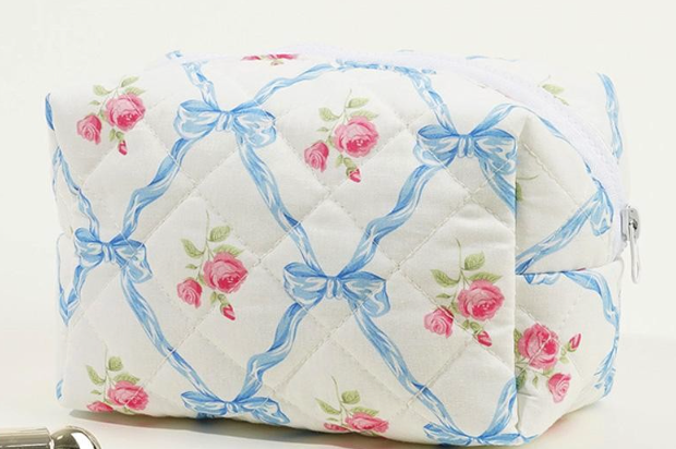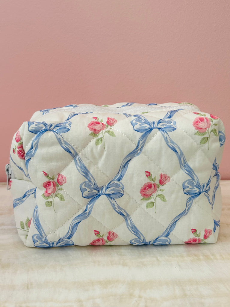 Quilted Flower & Bow Print Makeup Pouch - Blue