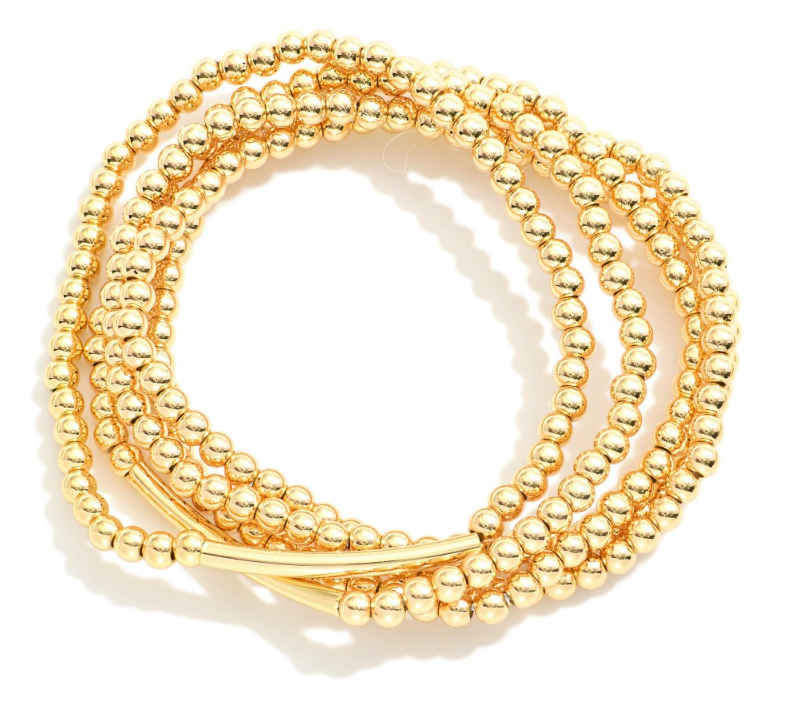 Set of Five Metal Tone Beaded Stretch Bracelets Featuring Metal Tube Bead