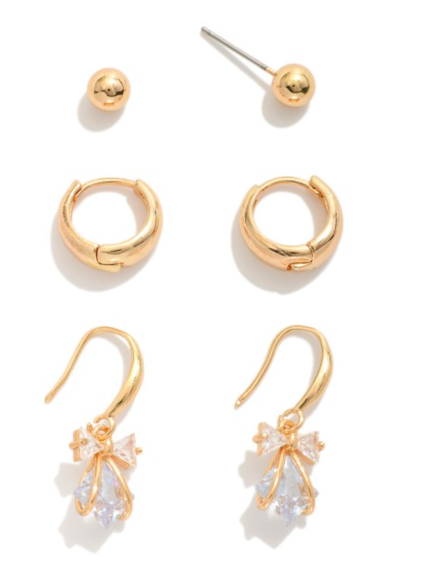 Set of Three Metal Tone Earrings Featuring Studs, Hoops, & Rhinestone Drop Earrings