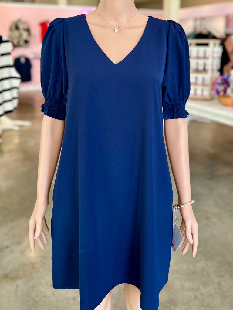 Lightweight and non-sheer, this solid dress features a flattering V-neck, short puffed sleeves with smocked cuffs, and handy side pockets. Perfect for everyday wear!