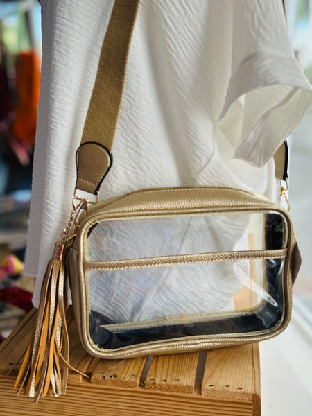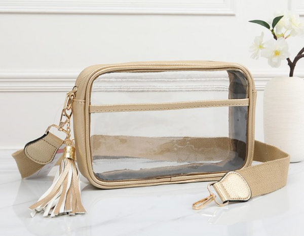 Clear PU Cross Body Bag With Leather Walls and Trim Featuring Detachable Leather Tassel