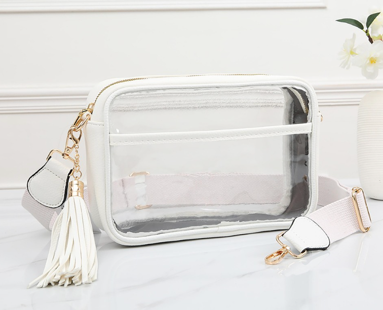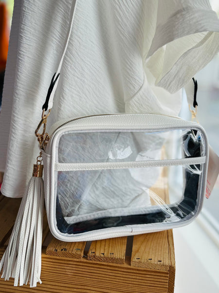 Clear PU Cross Body Bag With Leather Walls and Trim Featuring Detachable Leather Tassel