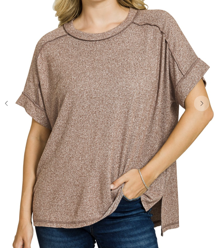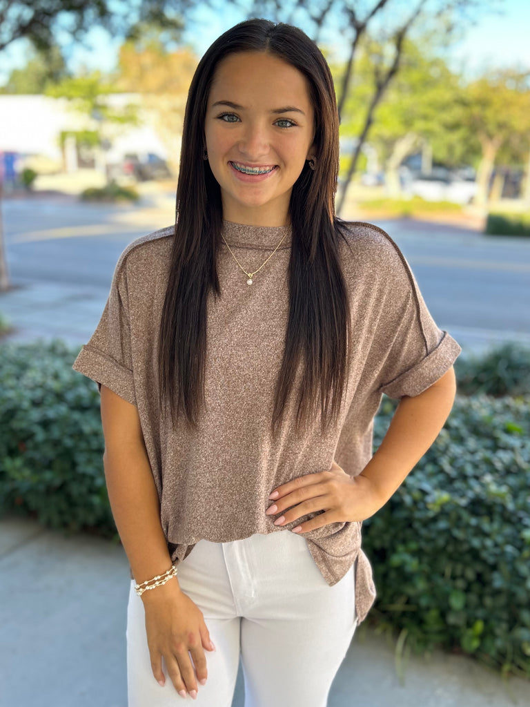 Stay comfy and cute in this soft brown mélange hacci short sleeve tee featuring a folded sleeve design, hi-low hem with side slits, and exposed seam details. Effortless and easy to wear, it’s the perfect go-to for laid-back days!