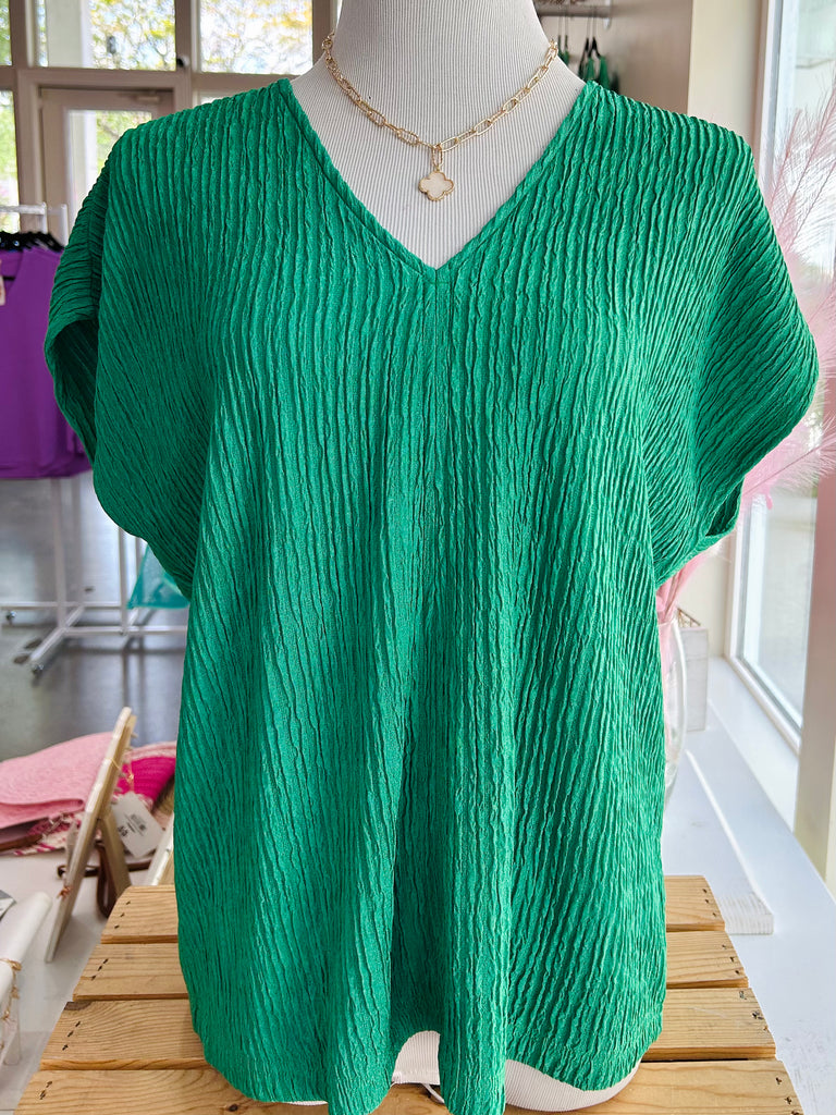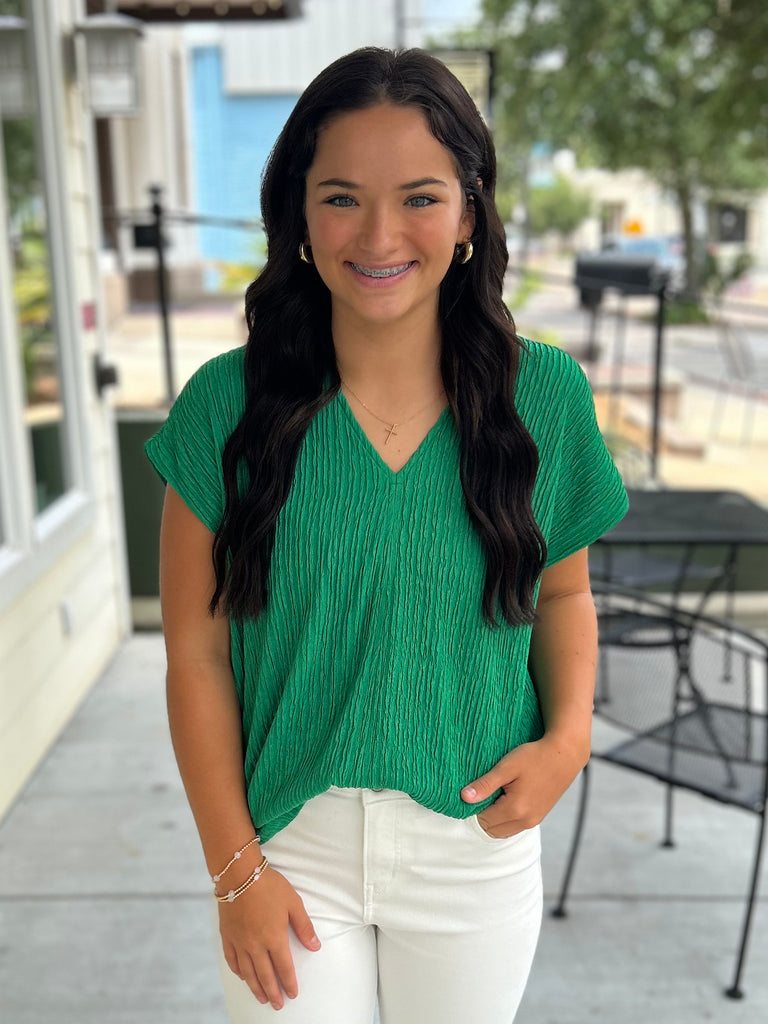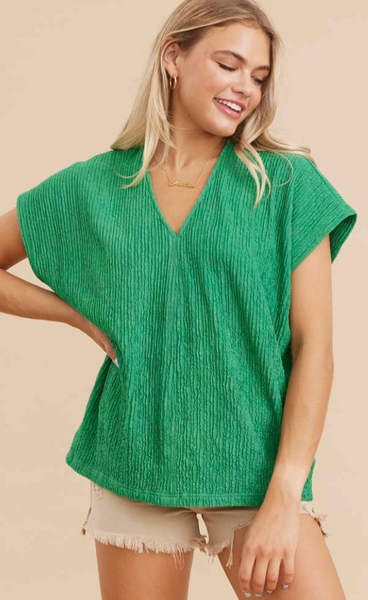 Super cute green top featuring a v-neckline, short dolman sleeves, and a fun texture! Perfect to dress up or down! Made of a polyester/spandex blend.