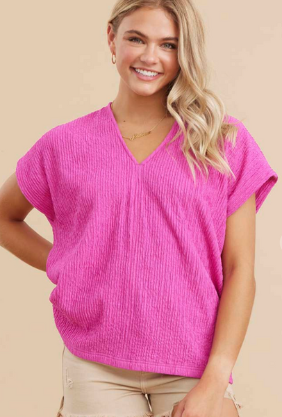 Super cute pink top featuring a v-neckline, short dolman sleeves, and a fun texture! Perfect to dress up or down! Made of a polyester/spandex blend.