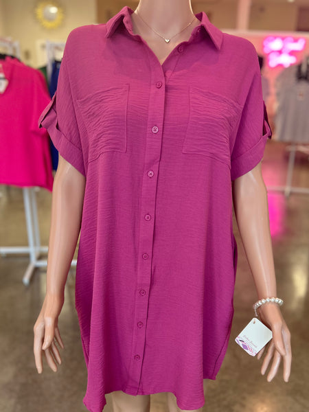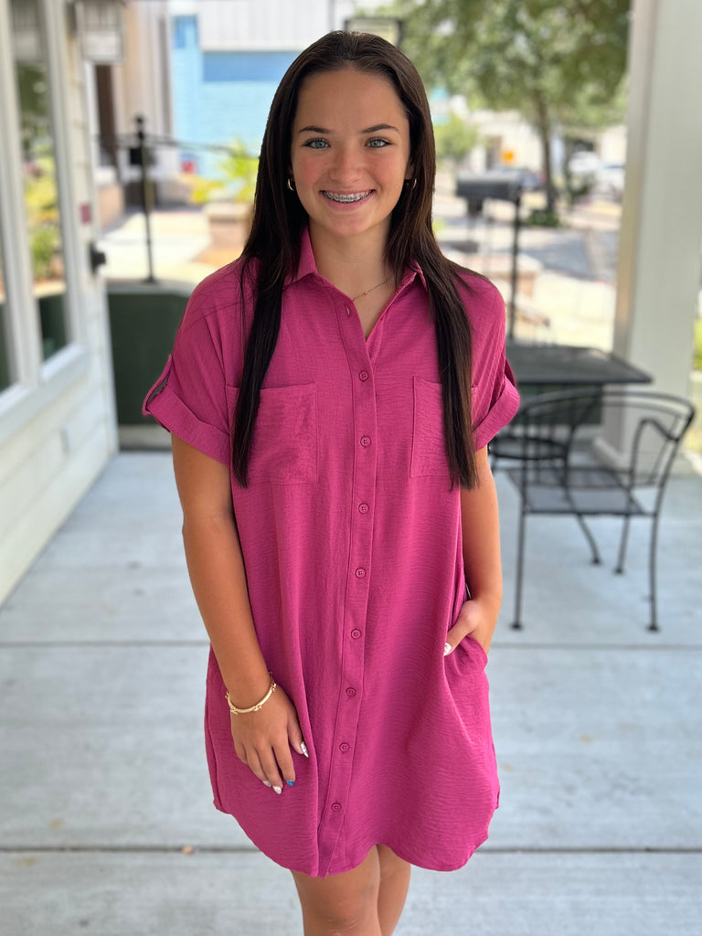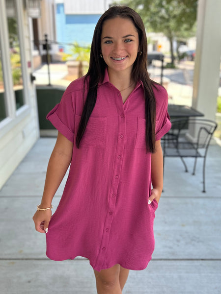 This mauve drop shoulder button-up woven shirt dress is the perfect mix of comfy and cool! Featuring functional pockets and a relaxed fit, it's an easy grab-and-go look you can dress up or down. Layer it, belt it, or wear it loose—so many ways to style!
