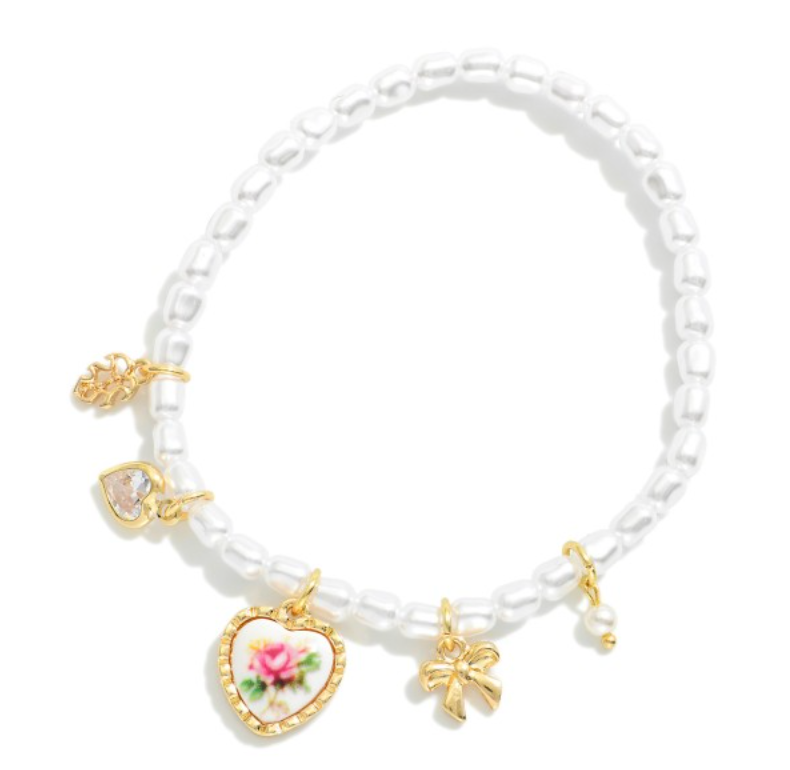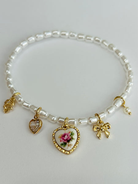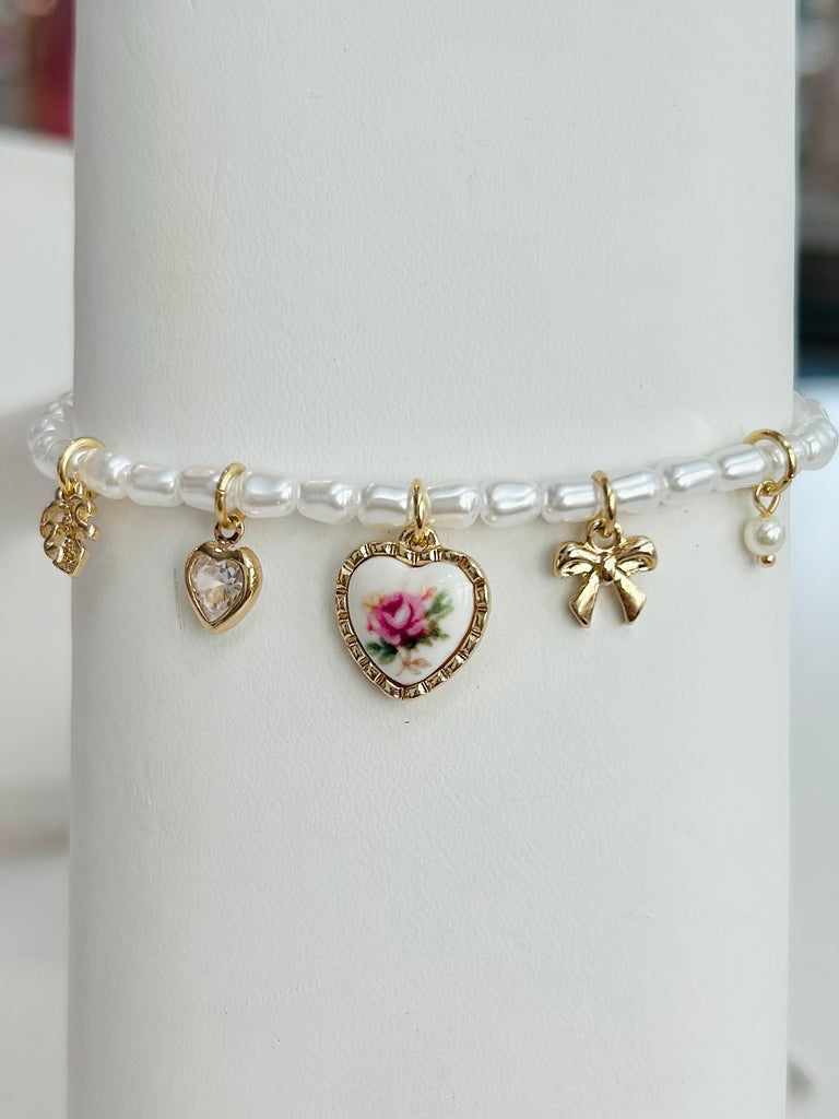 Pearl Beaded Stretch Bracelet Featuring Vintage Porcelain Pink Rose Heart Charm, Bow, Rhinestone Heart, And Leaf Charms