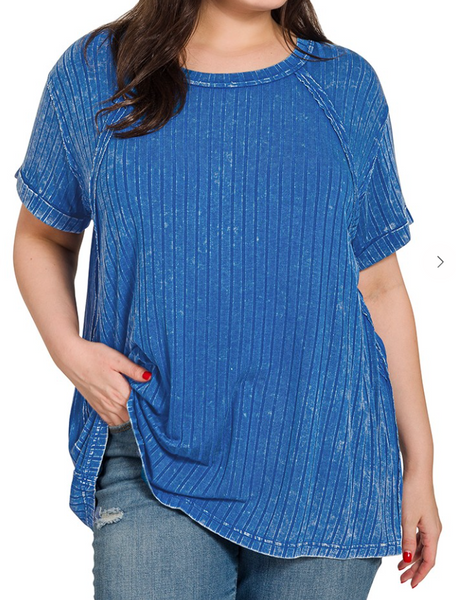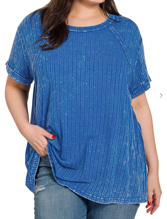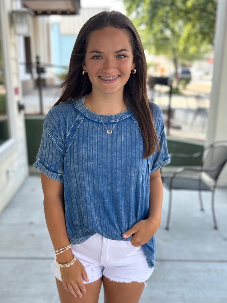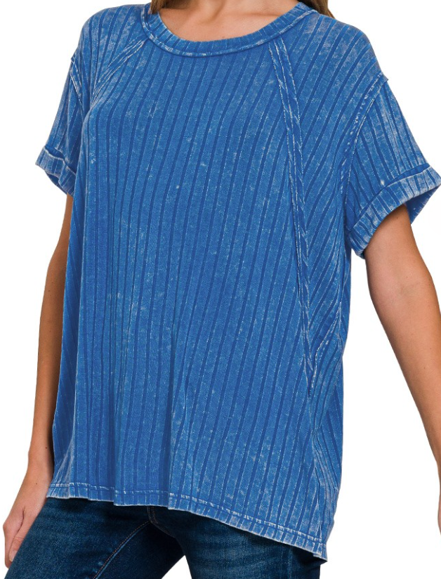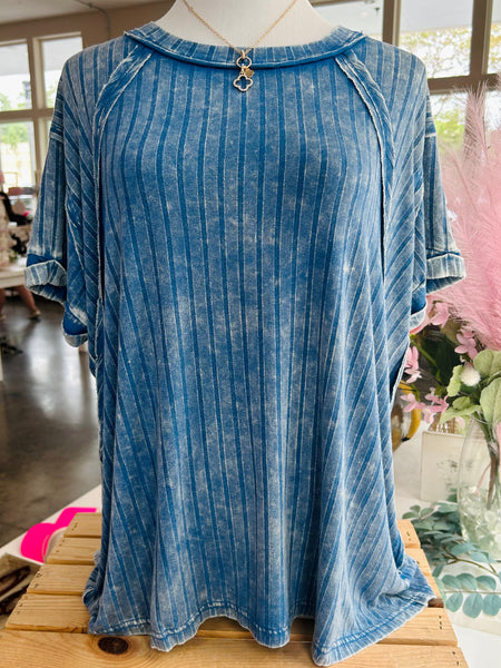 This dark blue top features a washed ribbed pattern, a rounded/boat neckline, a back patch detail, and raglan sleeves. So soft and cozy!