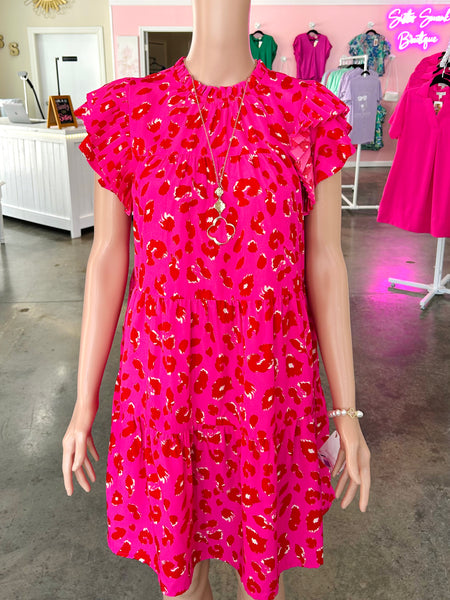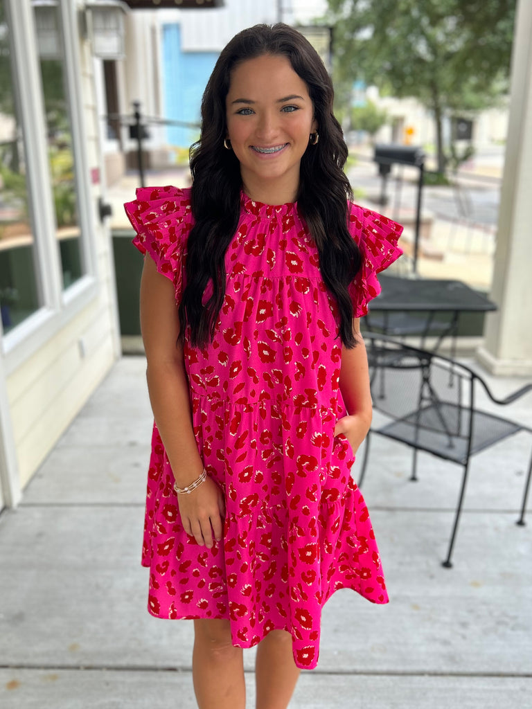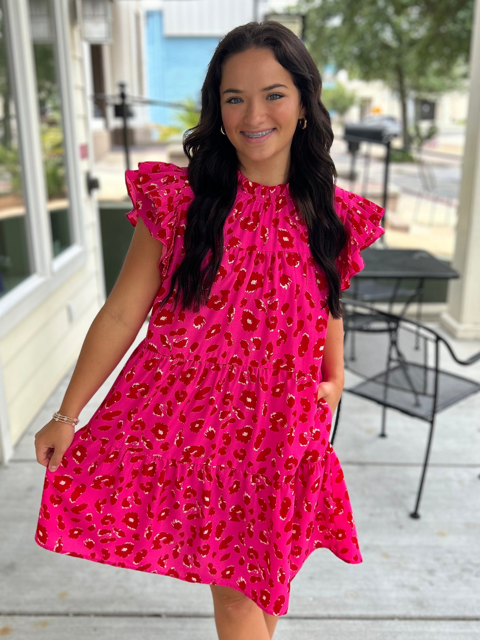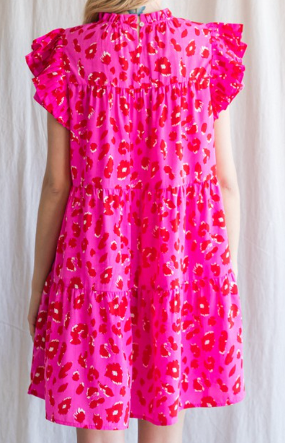 The Wild at Heart dress is bold, fun, and effortlessly cute. It features a hot pink leopard print, frill mock neckline, ruffle cap sleeves, and tiered layers. Lightweight and fun, this flirty silhouette is perfect for adding a pop of personality to any day!